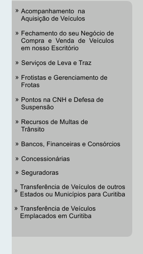 Prestamos serviços à financeiras, seguradoras e frotistas, como: vistorias do número de chassis e números de agregados, pesquisas de restrições judiciais e administrativas, levantamento de débitos em geral e regularização de transferência de propriedade de veículos retomados de busca/apreensão e sinistrados. Tratando-se de venda de veículos em leilão, providenciamos a transferência de propriedade para o nome dos arrematantes em todo o território nacional.